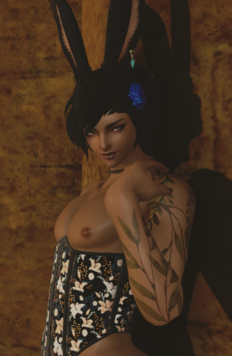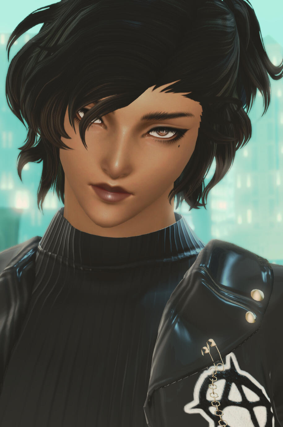Dark hair curls around an angular face with deep brown eyes shuttered by thick lashes. He possesses a wide nose and prominent lips and an olive skintone that would flourish under the sun, unmarked by any faded scar of note. A fresh dahlia is commonly found pinned in his hair, accompanied by a fragrant floral scent.Coy and coquettish, his interactions hardly progress past the point of playful banter, though he always endeavors to make the partners in his conversations feel doted upon. He's everyone's friend, and an incorrigible gossip. Despite this, he practices discretion when it suits him.His is a smooth tenor voice, velvet and smoke, with a charming smile that can light up a room. He laughs as frequently as he frowns, beholden to his emotions and rarely does he mask how he feels. Short of wearing his heart on his sleeve, he is open and honest with his opinions, always served with a silver tongue.He is employed at a bounty bar under the care of a Limsan mercenary company, The Steelgrin Sirens, and is no stranger to combat himself, even if he'd much prefer to avoid it.