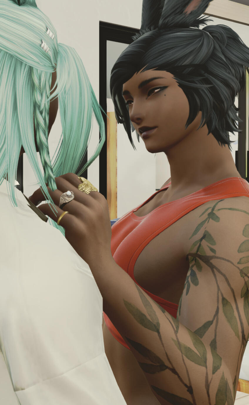 Born to Yrys Hyskaris and Liokki Djt-Dvre, Llyr was raised in Old Sharlayan in a quaint cottage off the beaten path. The dynamic of the family was not an unfamiliar one to many; with a doting mother and a distant father, Llyr was encouraged to pursue his talents as only a Sharlayan can, by devoting every waking moment to study. He poured himself into the arts, excelling at painting and sculpting, and many hailed him as a young prodigy for his skill. As he grew older, however, the praise he'd received soon grew cold as his parents endeavored to shift his interests to those of better use. Over a century of devoting himself to the arts, and he found himself a gleaner for the Forum.It was with great resignation that he accepted the assignment, but on his first foray outside of Sharlayan, he found himself more enamored with painting unfamiliar landscapes than gathering anything of note. Unsurprisingly, upon his return home, he was relieved of his gleaner duties.With the skill of an artist in low demand, and desperate for a job to cover his monetary needs, he took what shifts he could at The Last Stand before finally disembarking from Old Sharlayan to Limsan shores. It was there that he plied his ability as a painter to illustrate bounty posters and maps for a local mercenary company while bartending at their establishment, the Siren's Call.He's gotten into his fair share of skirmishes, though would be loathe to consider himself a true combatant. He can hold his own in a scuffle, but would sooner find himself out of harm's way than escalate to violence. He will absolutely cheer on a bar fight, though.Despite his charming persona and puckish humor, he's a dominant man that prefers things done his way.